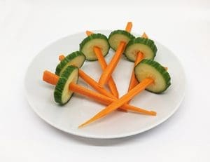 2. Faites un trou au centre des tranches de concombres et insérez-y les bâtonnets de carottes.