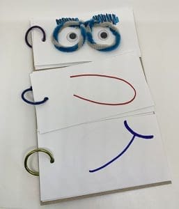 Expliquez-leur que sur le 1er paquet de feuilles, ils peuvent dessiner plusieurs sortes d’yeux, sur le 2e, des nez différents et sur le 3e, plusieurs bouches.