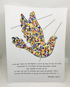 Pendant le bricolage, faites un retour sur l’histoire du jour : lors du baptême de Jésus, le Saint-Esprit est descendu sur lui sous la forme d’une colombe.